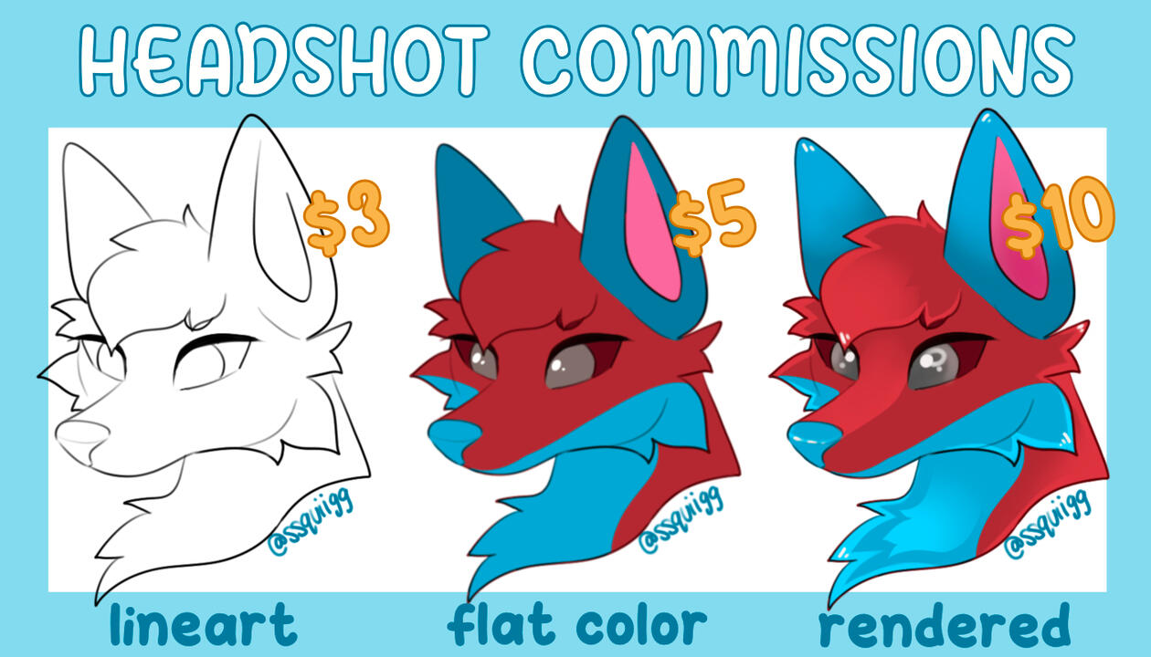 Headshots:$3 - Lineart$5 - Flat color$10 - Rendered